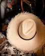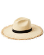 Natural classic fedora hat with a 9 cm brim and frayed edge.